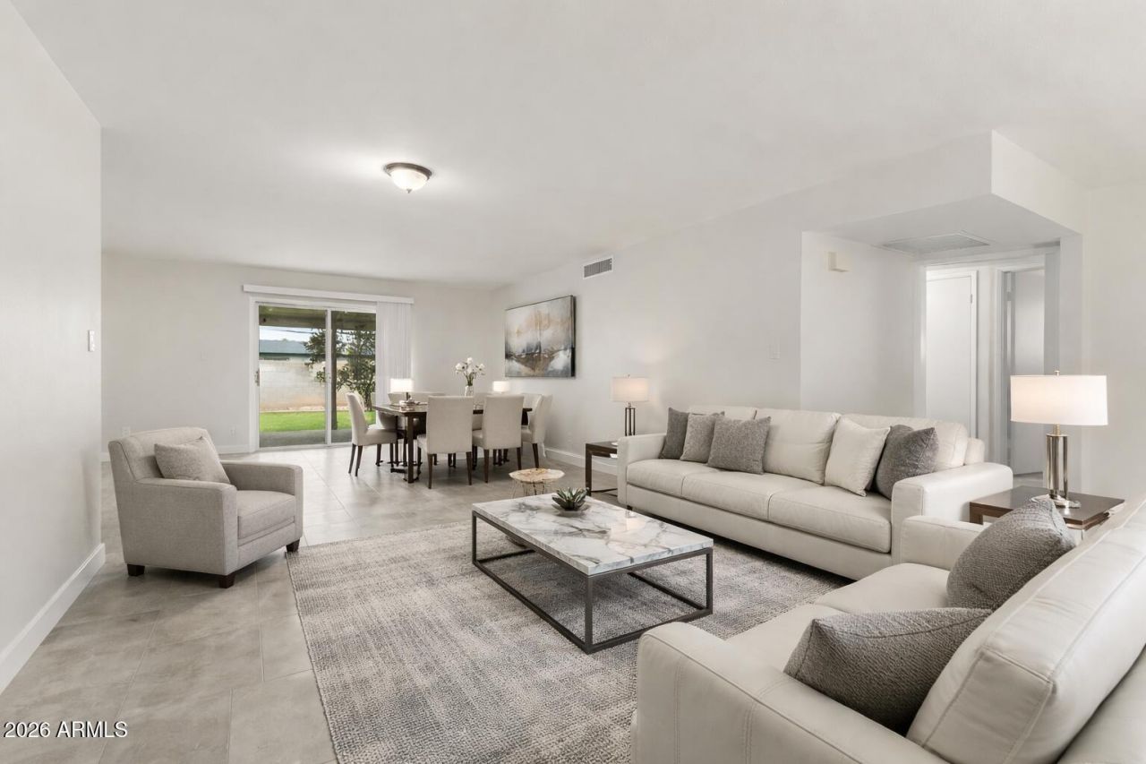 MAJOR PRICE ADJUSTMENT. Newly remodeled 4 bed, 2 bath 1-story home with a 2-car garage, designed for modern upscale living. Features tile flooring throughout, brand new kitchen cabinetry, quartz countertops, updated bath vanities, fresh paint, and new A/C. Open-concept layout flows seamlessly from living and kitchen spaces to a full-width covered patio, ideal for indoor-outdoor entertaining. Private en suite primary bedroom, ceiling fans in every room, pantry, and ample storage including a garage utility room. The patio overlooks a grass backyard with mature fruit trees. EV charger in garage. Convenient access to the 60, 101, and 202 freeways, Tempe Marketplace, Optimist Park, and top-rated schools.