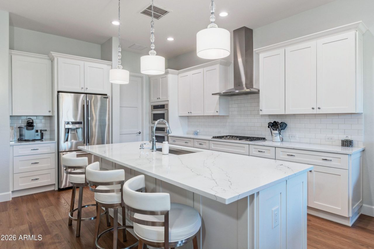 Beauty, comfort, & value! List price is $51,000 below appraised value & more than $70,000 below original purchase price. Approximately $200,000 in builder upgrades. This home sits on a premium lot backing to a common area. The kitchen was redesigned with a built-in wall oven, gas cooktop and enlarged island with a wine cooler. The white cabinetry has soft-close doors & drawers, & pull-out shelves. Quartz counters run throughout the home. The primary bath has a curbless tiled shower. The guest bath has a walk-in shower instead of a tub. Top-quality Luxury Vinyl flooring throughout the home. The LG appliance package stays, including the front-load washer and electric dryer. The home also has Aterra smart home & media features. Pavers & electronic sunshades add charm to the back patio. This is a lock and leave villa. That means less work and more fun. The outside care is handled for you. You will enjoy all that PebbleCreek has to offer. It is an award-winning community with three golf courses, pickleball, tennis, bocce ball, and three pools, both indoor and outdoor. There are restaurants, a theater, a creative arts center, and a fitness center too.