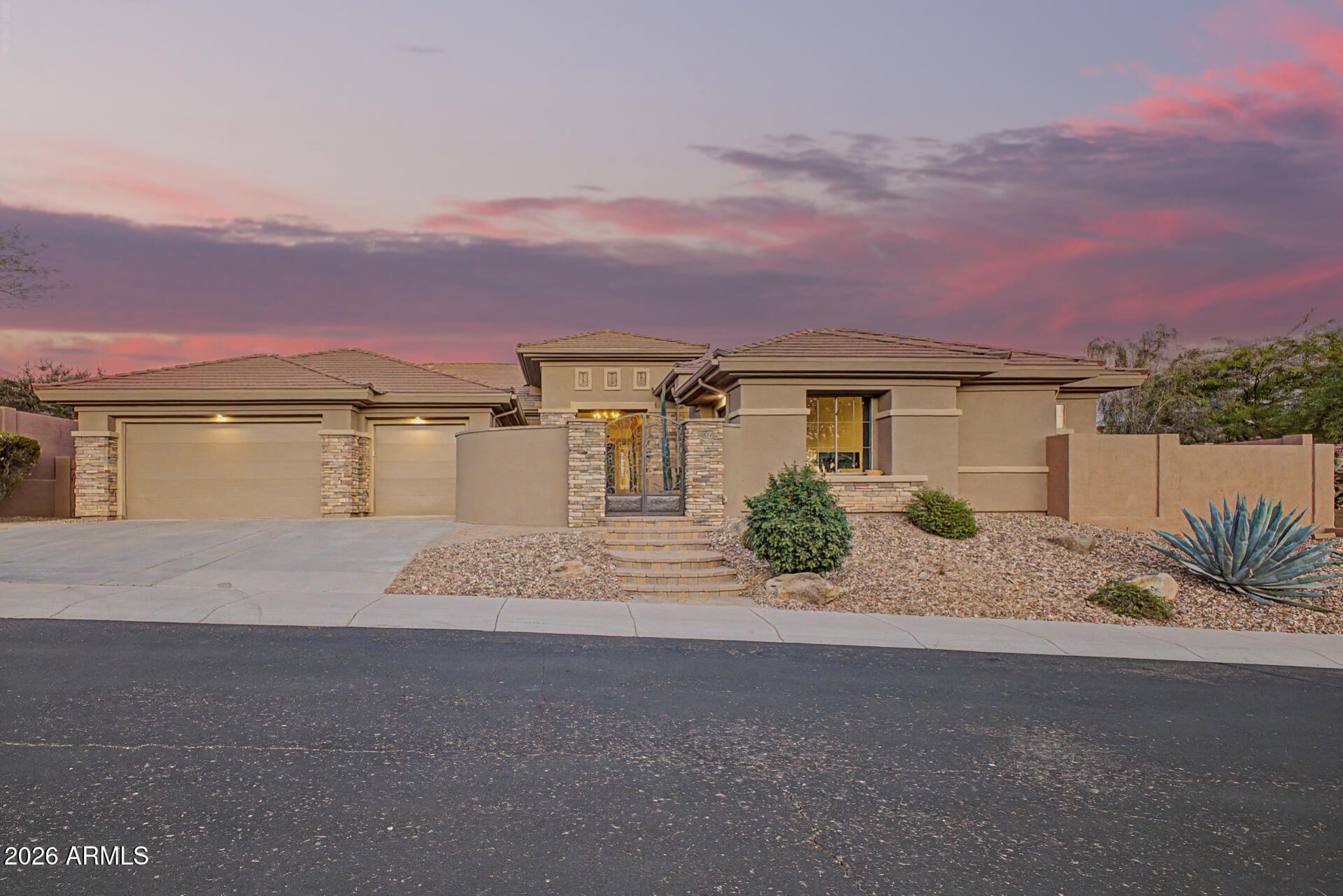 Your dream home is finally within reach. This stunning estate features a 3-car garage, timeless stone accents, and a charming courtyard with a tranquil water fountain that sets a welcoming tone. Inside, the home offers a bright and open living room with soaring ceilings, elegant lighting, abundant natural light, and sleek tile flooring. The inviting family room connects seamlessly to the backyard through sliding glass doors, creating effortless indoor-outdoor living. The gourmet eat-in kitchen showcases granite countertops, custom cabinetry, pendant lighting, a striking tile backsplash, stainless steel appliances, a walk-in pantry, a large center island, and a breakfast bar peninsula--ideal for both everyday living and entertaining.A cozy den provides flexible space for a home office, study, or private retreat. The spacious primary suite includes plush carpeting, a spa-like ensuite with dual sinks and a soaking tub, and a generous walk-in closet. The resort-style backyard is designed for Arizona living and perfectly positioned on a private HOA desert preserve, offering enhanced privacy and unobstructed natural views. With an east-facing orientation, it captures beautiful Arizona sunrises and provides a serene backdrop for everyday living. Enjoy a covered patio, paver design, fire pit and outdoor fireplace, spa and pool, and stunning mountain and desert views that complete the setting. Located in the highly desirable guard-gated Anthem Country Club, residents enjoy access to championship golf, resort-style clubhouses, fitness centers, tennis and pickleball courts, pools, dining, scenic walking paths, and a vibrant social lifestyle surrounded by breathtaking desert and mountain scenery. Make this exceptional property yours today!